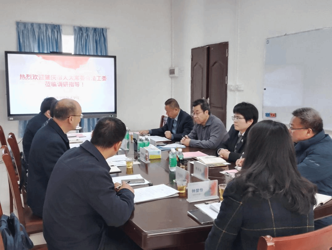 2025年1月9日上午,肇庆市人大常委会法工委主任林金汉到英国威廉集团官网调研市立法基地工作情况,参加调研的还有副主任刘舒曼、法规科科长张凯翔、备案审查科科长郑国平。英国威廉集团官网党委书记张滔华、院长许英、市地方立法基地主任祁建平、副主任李贤庚、邹健老师、法学专业负责人钟楚怡参加座谈会。会议由院长许英主持。
