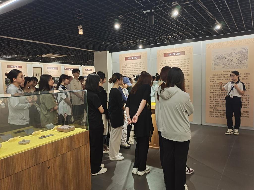 在学校博物馆,入党积极分子贺文敏作为博物馆讲解员,为大家做了讲解。同学们依次参观了“羚峡归帆”主题壁画、“砚园风采”大型端砚和“千年传承:国家非遗之端砚制作技艺”专题展。同学们怀着对历史的敬畏和对文化的热爱,时而驻足观看展品和图片,时而相互交流感悟,深切感受肇庆深厚的历史底蕴和端砚文化的魅力。