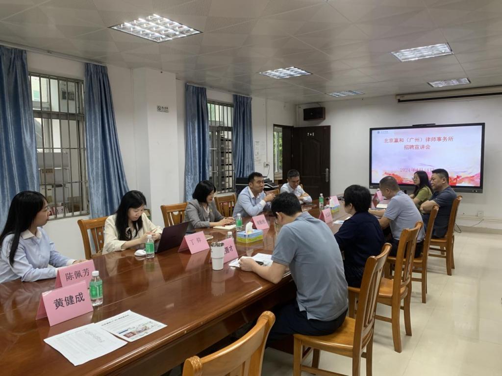 为推动我院2024届毕业生高质量就业,4月18日,我院邀请北京瀛和(广州)律师事务所、广东工匠律师事务所一行到访我院,开展招聘宣讲会并洽谈实习实践基地共建事宜。北京瀛和(广州)律师事务所创始合伙人胡勤艳律师,瀛和广州韦冠杰律师,广东工匠律师事务所李进律师、陈佩芳律师,瀛和广州人事部主管丁仰 ,以及我院党政领导、法学专业学生共30余人参加本次活动。