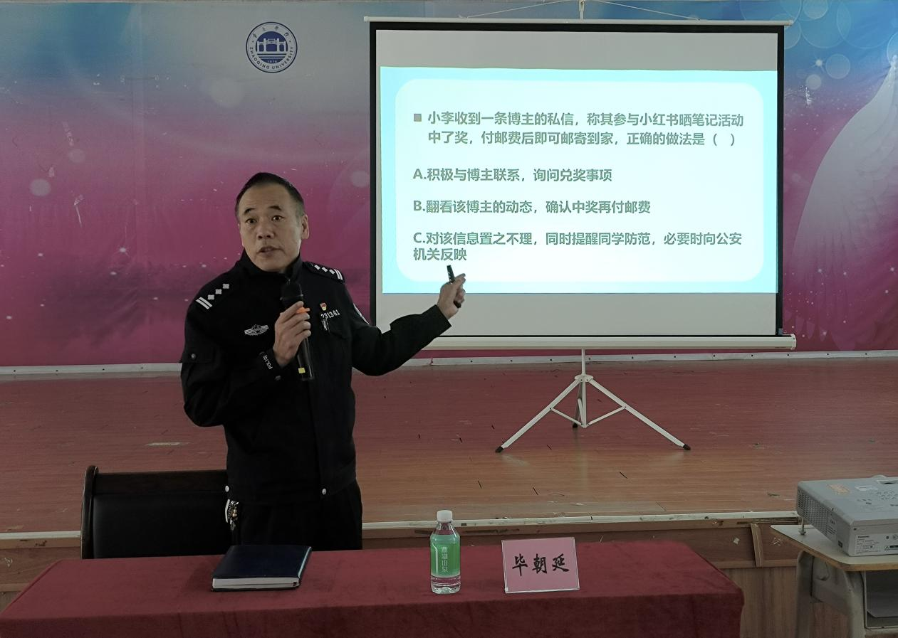 宣讲现场气氛热烈,毕所长用生动的语言讲述了一个个真实案例,让同学们进一步提高了防范电信网络诈骗的意识,守护好同学们的人身和财产安全。