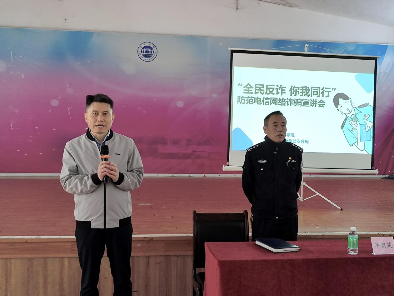 本网讯(新闻中心 龚明月 谢倩怡 陈炜琪)为进一步提高大学生的反诈意识和风险防控能力,增强同学们的自我保护意识,维护同学们的合法权益,12月1日,大冲派出所所长毕朝延受邀,到星湖校区小礼堂为我院2023级全体新生开展“全民反诈,你我同行”防范电信网络诈骗宣讲会。学院办公室主任王铭主持宣讲会。