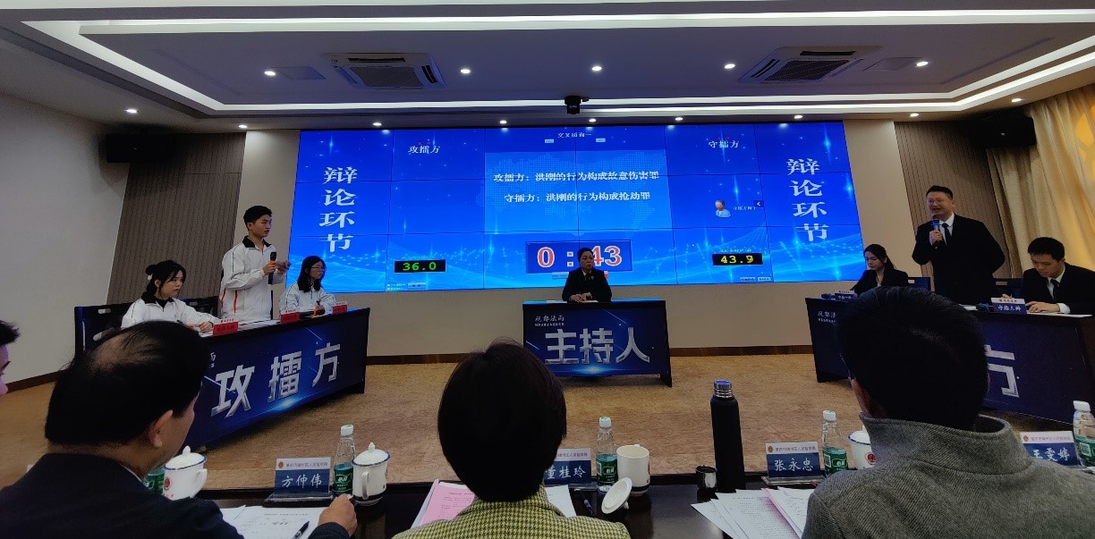 为训练学生的刑事业务实践能力,选拔优秀选手参加竞赛,1月1日至4日,学院举办了“砚都法雨”初赛,由祁建平、林尤鹏、易海辉、孟伟涛老师作为评委,最终选出了薛俊、黄君铃、李欣三位同学组队,由易海辉博士作为指导老师,法律系主任林珣带队参加了正式比赛。林尤鹏老师受邀作为评委出席,在端州检察院结对培养的学徒,也来到比赛现场观赛学习。
