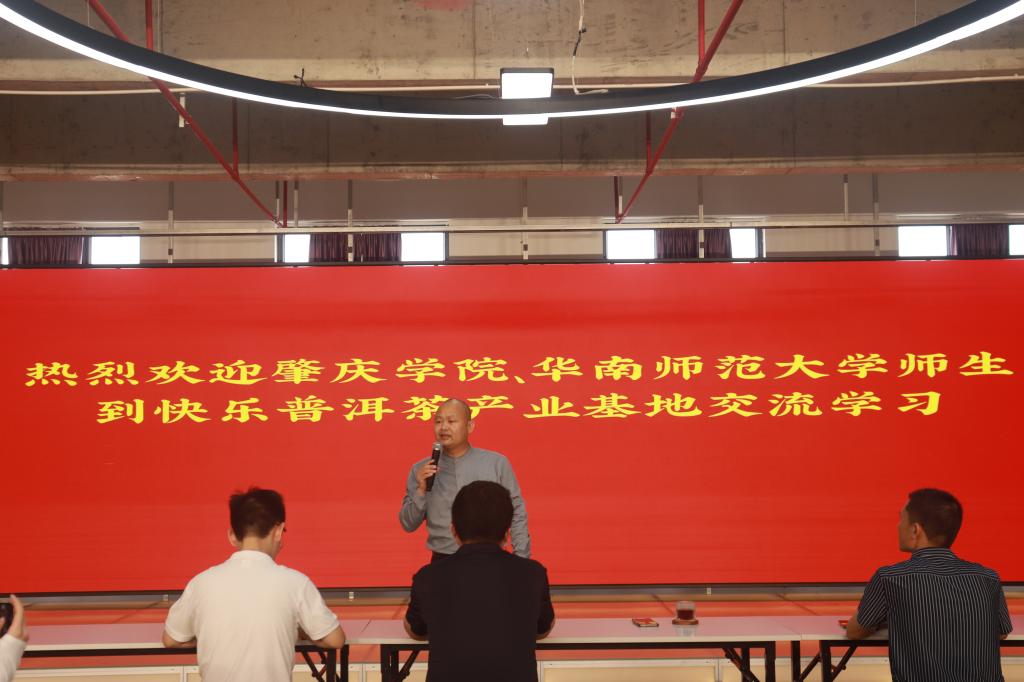 在快乐普洱茶产业基地,实践团受到了受到了国家一级评茶师、中国茶叶流通协会副会长、广东省茶业行业协会副会长、快乐普洱茶产业基地创始人吴世海先生的热情接待。师生们分别参观了茶史博物馆区、专业普洱茶仓、茶业培训学校、党支部红色展馆,感受传承的力量,体验创业的历程,深入了解了快乐普洱茶产业基地的发展历史与未来的发展规划。在交流座谈会上,师生们一边细细品着醇厚馥郁的普洱茶,一边共同探讨了如何将茶基地做大做强。李勇博士就“天时、地利、人和”三个要点,交流探讨了普洱茶基地的未来发展方向。