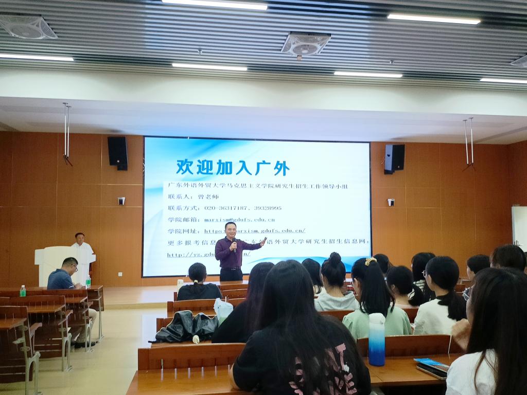 宣讲会上,毛国民等从学院概况、学科特色、招生方向、导师简介、培养方式、奖助政策、报考事项等方面系统地介绍了广东外语外贸大学马克思主义学院深厚的学科优势和办学特点,并向同学们发出了真诚的报考邀请。宣讲结束后还与我院学生进行了答疑互动,解答了研究生招生政策等相关问题。