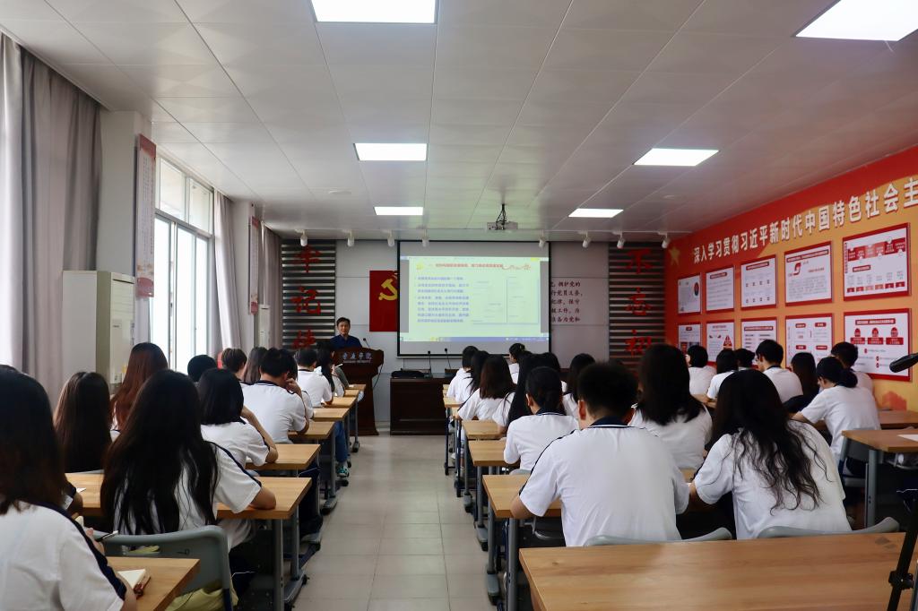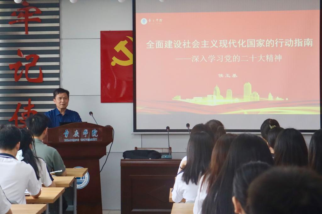 侯玉基以“过去5年的工作和新时代10年的伟大变革”、“新时代新征程中国共产党的使命任务”、“全面建设社会主义现代化国家的谋划安排”等方面内容进行宣讲解读。课上,侯玉基结合发生在师生们身边的例子,为同学们进行生动的宣讲解读:他以肇庆的天空越来越蓝、水质越来越清、风景越来越美的变化来讲述美丽中国建设迈出的重大步伐,以肇庆学院由“申硕改大”到“改大申博”的层次提升来讲述高等教育发展和科教兴国战略,用真实的数据、生动的案例带领同学们回顾了过去的成就与变化,以及今后努力的方向。