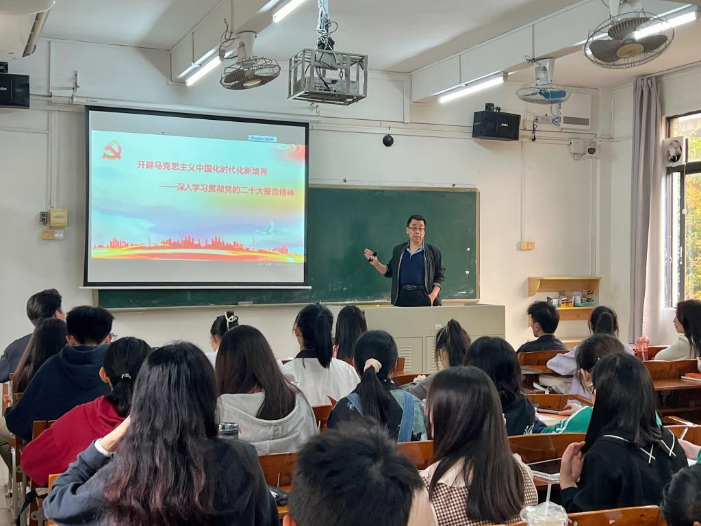 本网讯(新闻中心 陈炜琪 黄镓瑶)3月10日,我院院长祁建平在第一教学楼320课室开讲春季学期“思政第一课”,主题为《开辟马克思主义中国化时代化新境界——深入学习贯彻党的二十大精神》,2020级法学班全体同学参加本次课程。