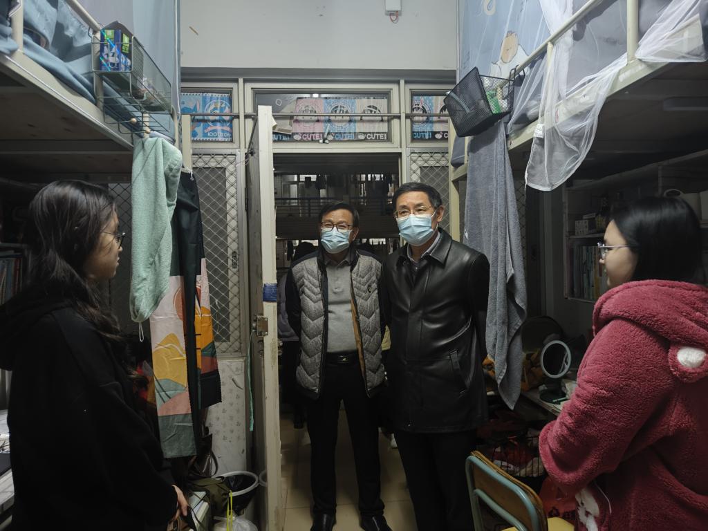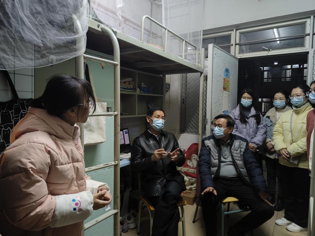 吴校长走访了联系的2021级思想政治教育、知识产权专业学生宿舍,了解同学们在学习、生活、离校返家等方面的现状和需求,并就疫情防控、学业考试等方面认真听取了同学们的意见和建议。