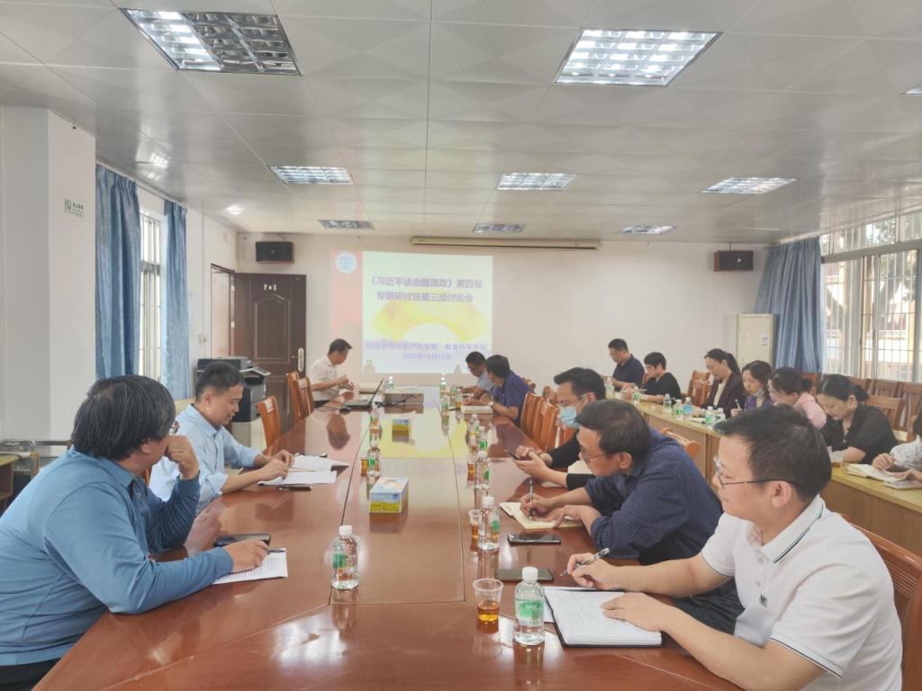 本网讯(新闻中心 陈炜琪)为深入学习贯彻习近平新时代中国特色社会主义思想,宣讲新时代党的创新理论,根据学校安排,10月12日,我院在学院204会议室,与教育科学学院联合开展学习《习近平谈治国理政》第四卷专题研讨班。我院及教科院党政领导、党支部书记、专职组织员参加本次学习。研讨班由我院党委书记侯玉基主持。