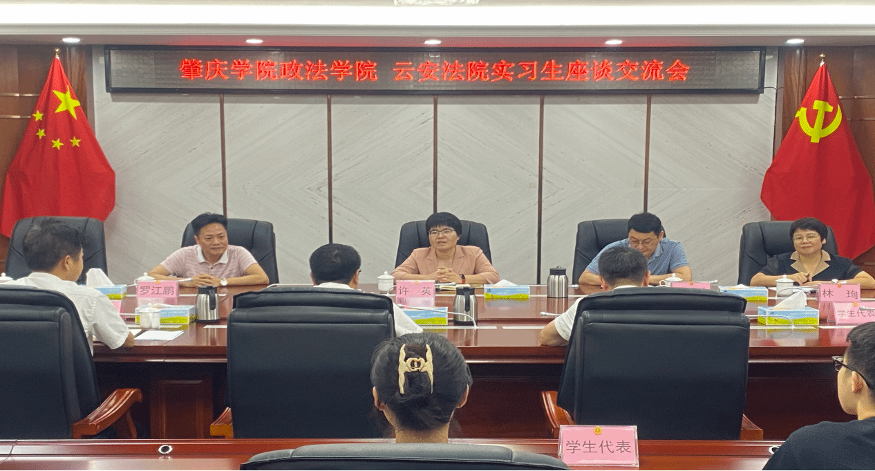 在云浮市云安区人民法院,该院副院长林国灿、政治部主任曾华生、办公室主任黄照光等接待了许英一行。座谈会上,实习生代表向许英一行汇报了实习期间的收获、成长与感悟,法院领导和实习导师对我院实习生表现均给予肯定,两院就未来在人才培养与输送、课题调研等方面开展深入合作达成初步意向。