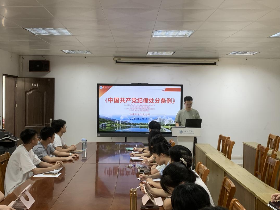 法律系学生党支部组织开展五月份主题党日活动,召开党纪学习教育工作动员部署会,传达学习上级党委会议精神,安排部署党支部党纪学习教育工作,并开展了党纪学习教育专题学习,逐条研学《条例》一、二章内容。党支部书记黄健成主持会议并做部署安排,支部全体党员参加。