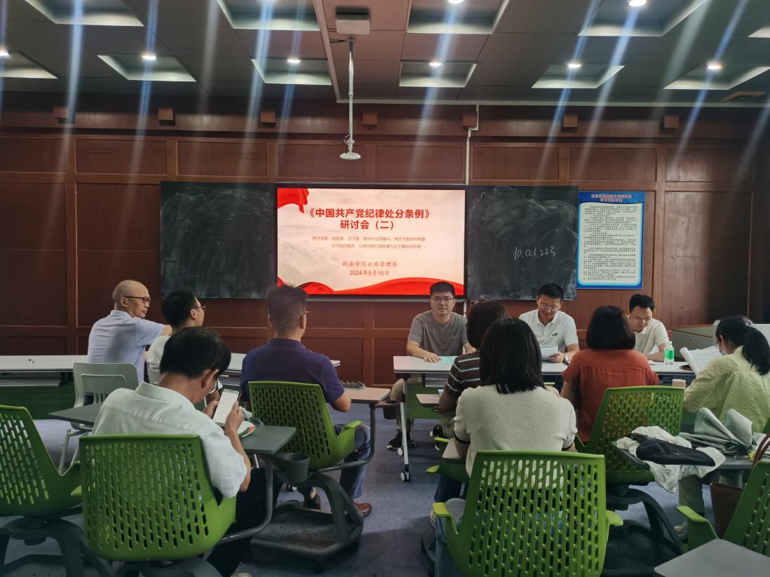 公管系党支部书记李勇主持召开党纪学习教育学习会,带领全体党员集体学习《条例》部分章节,并结合工作和学习体会进行交流探讨,要求全体党员干部要以学习贯彻纪律处分条例为契机,深入领会《条例》的重要意义,全面准确理解《条例》的丰富内涵,增强执行《条例》的政治自觉、思想自觉、行动自觉,坚持把纪律挺在前面,切实维护纪律的刚性、严肃性,为推动学院高质量发展提供坚强纪律保障。