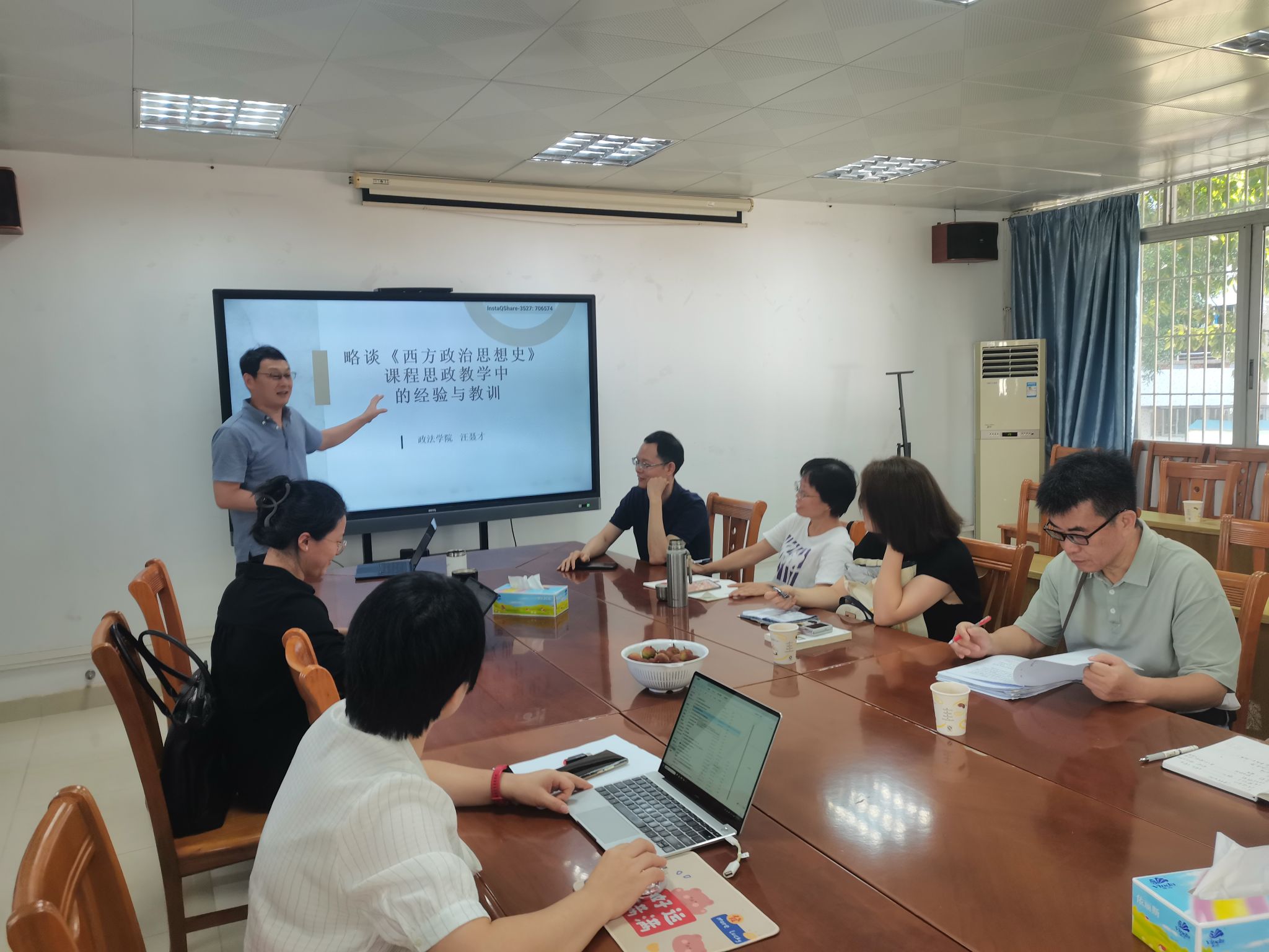 省级课程思政示范课堂主持人汪聂才副教授以《略谈<西方政治思想史>课程思政教学中的经验与教训》为主题,分享了项目申请的经验以及在课程思政教学工作中的认识和经验。就如何提高课程思政项目立项成功率,汪老师分享了如下方法:一是深刻领悟政策文件精神,包括但不限于教育部《高等学校课程思政建设指导纲要》、《广东省教育厅关于强化课程思政建设一流课程的意见》等;二是理解课程思政的内涵;三是要结合专业特点分类推进课程思政建设;四是要将课程思政融入课堂教学建设全过程,落实到课程目标设计、教学大纲修订、教材编审选用、教案课件编写各方面,贯穿于课堂授课、教学研讨、实验实训、作业论文各环节。