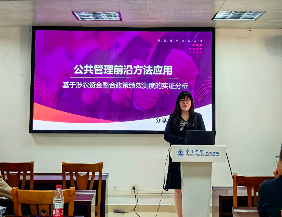 李莹博士以《公共管理前沿方法应用:基于涉农资金整合政策绩效测度的实证分析》为题,从“测什么、为何测、如何测”三大维度系统解析了公共政策绩效评估的逻辑框架,并结合涉农资金整合政策过程深入分析了演化博弈法、因果过程追踪法、调查实验法等的应用问题。李博士生动演绎了“问题-方法-应用”的研究闭环,通过多主体互动模拟、政策效果量化评估、利益相关者行为分析及微观机制解构,为师生理解复杂理论工具的实际操作提供了鲜活案例。