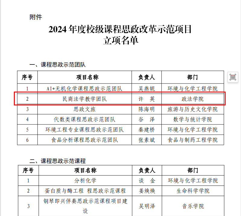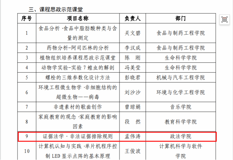 我校教务部近期公布了2024年度校级课程思政改革示范项目立项名单,本次我院老师申报的三个项目均获立项。其中,我院院长许英教授牵头申报的项目“民商法学教学团队”获课程思政示范团队立项,孟伟涛博士申报的“证据法学·非法证据排除规则”以及林珣副教授申报的“法理学·法的作用之法的局限性”获课程思政示范课堂立项。