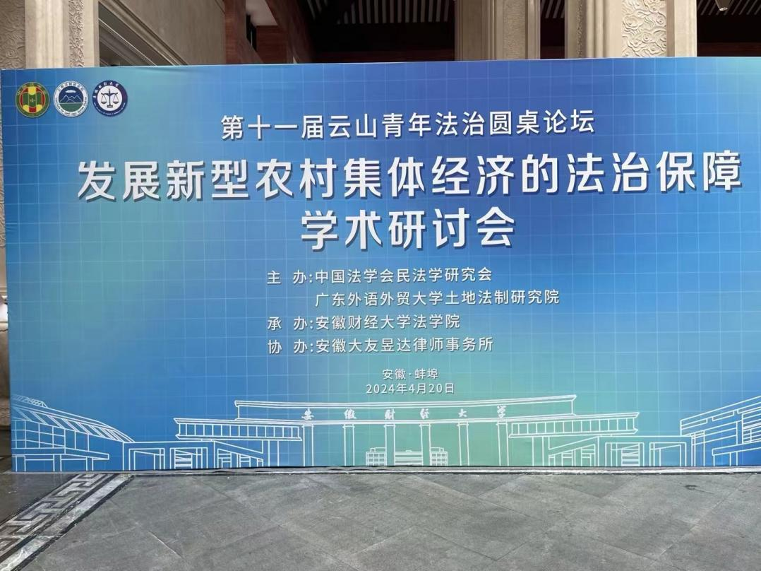 4月20日,由中国法学会民法学研究会、广东外语外贸大学土地法制研究院主办,安徽财经大学法学院承办,安徽大友昱达律师事务所协办的第十一届云山青年法治圆桌论坛暨“发展新型农村集体经济的法治保障”学术研讨会在安徽蚌埠举行。来自中国政法大学、中国农业大学、中南财经政法大学、吉林大学、西北政法大学、广东外语外贸大学、南开大学、苏州大学、安徽财经大学、肇庆学院等20多家单位近60名专家学者参加论坛。