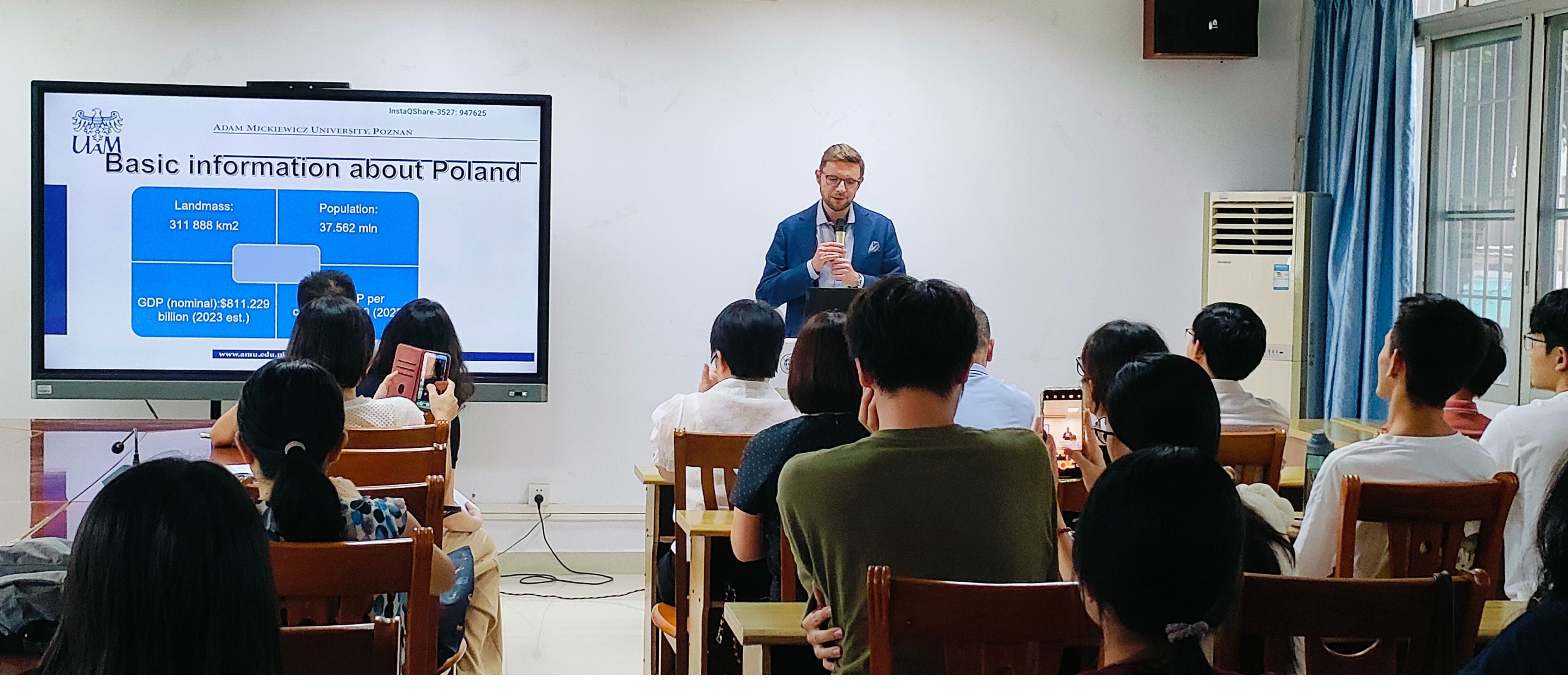 Wiśniewski博士以波兰的历史转折点、立法与行政框架、司法体系及外交策略等各方面介绍了波兰的基本情况。通过分析贸易进出口等数据,阐述了欧盟在波兰发展中的作用以及波兰与中国的外交关系。问答环节,师生积极就兰外交政策与国际局势等问题进行互动,反响热烈。