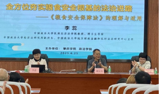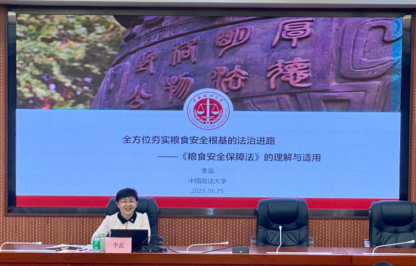 中国政法大学民商经济法学院教授、博士生导师李蕊以《全方位夯实粮食安全根基的法治进路——〈粮食安全保障法〉的理解与适用》为题,为现场师生带来精彩讲座。李蕊教授从粮食安全的内涵切入,系统解读了《粮食安全保障法》的立法背景、目的及核心要义。她指出,该法于2023年12月通过,2024年6月正式施行,涵盖耕地保护、粮食生产、储备流通、应急管理等11章74条内容,是我国粮食安全领域的重要法治保障。讲座中,李蕊教授结合法律条文与典型案例分析了该法的鲜明特征与实施路径,并强调我国通过法治手段筑牢粮食安全防线的重要性。在交流环节,参会人员围绕粮食节约、耕地保护等议题与李蕊教授展开积极互动,现场气氛热烈。我院师生纷纷表示,本次讲座不仅开拓了对粮食安全法治化的认知与理解,也为相关领域科研教学发展提供了新视野新思路。