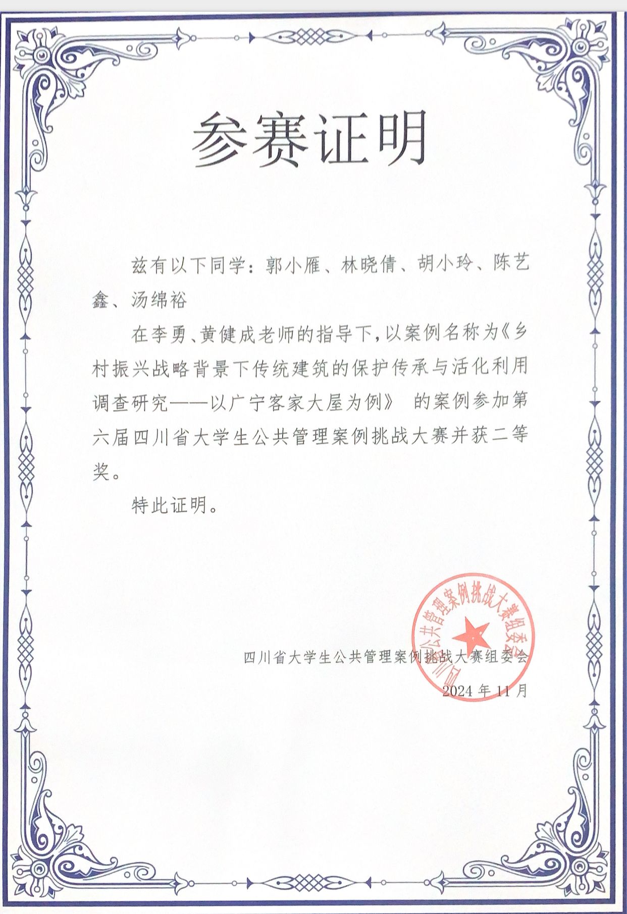 在比赛的准备过程中,在英国威廉集团官网李勇、黄健成老师的指导下,由2023级行政管理专业郭小雁、林晓倩、胡小玲、陈艺鑫、汤绵裕五名同学组成的团队,凭借他们的团队协作,提交了题为《乡村振兴战略背景下传统建筑的保护传承与活化利用调查研究——以广宁客家大屋为例》调研报告参赛。该团队深入客家韵味浓厚的村落一肇庆市广宁县江屯镇福善里村、积善里村、福隆里村,通过实地考察与问卷分析,以当地在保护传承与活化利用传统建筑中遇到的问题为切入点,旨在综合分析,总结经验,提出一套系统化的、可借鉴的传统建筑的保护传承与活化利用路径框架,推动乡村振兴战略的落实。