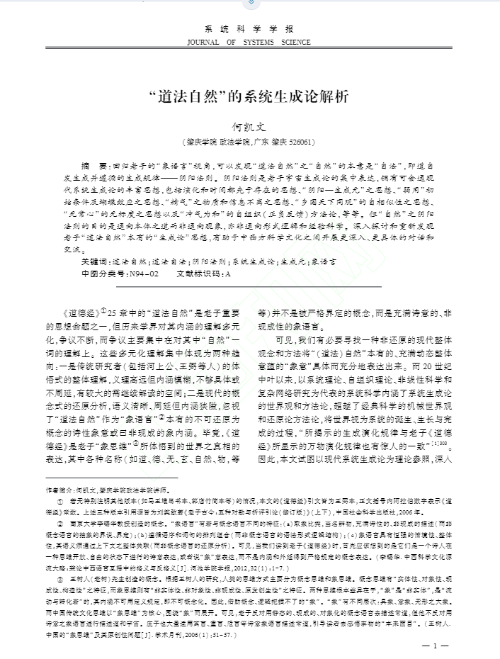 我院公管系何凯文博士在核心期刊《系统科学学报》2025年1期发表论文《“道法自然”的系统生成论解析》(现处于网络首发)。《系统科学学报》现为北大核心期刊和CSSCI来源期刊。 该论文通过回归老子《道德经》本有的“象语言”视角,以现代系统生成论为参照,探讨《道德经》中重要的思想命题:道法自然。论文的主要观点是,“道法自然”之“自然”的本意是“(道法)自法、自律”,即道自发生成并遵循的生成规律———阴阳法则;...